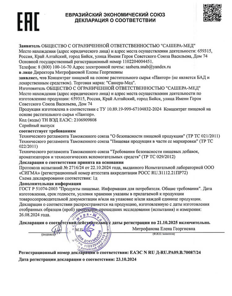 Сертификат соответствия Пантор