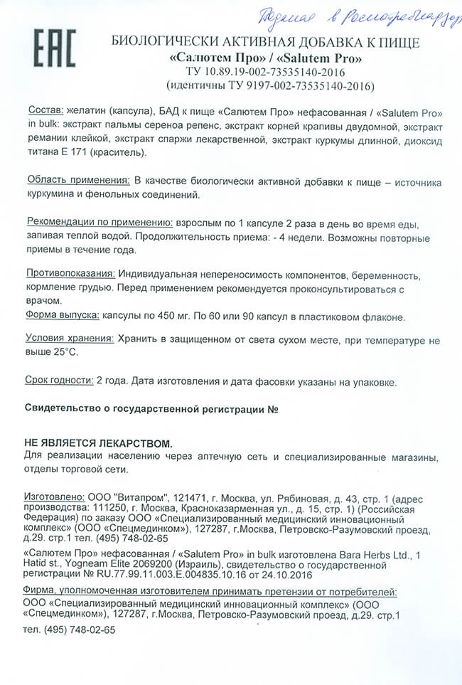 Салютем Про оказывает комплексное воздействие на мочеполовую систему мужчин, способствуя уменьшению воспалительных процессов в предстательной железе и нормализации мочеиспускания. Препарат замедляет гиперплазию тканей простаты, снижая давление на мочеиспускательный канал, что облегчает отток мочи. Капсулы Салютем Про стимулируют синтез тестостерона, поддерживая гормональный баланс, а также улучшают микроциркуляцию в тканях простаты, что способствует снятию отечности и дискомфорта. Растительные компоненты препарата обладают противовоспалительными, антиоксидантными и андрогеноподобными свойствами, обеспечивая восстановление потенции и повышение сексуальной энергии. Салютем действует мягко, не вызывая раздражения слизистых оболочек и системных побочных эффектов.