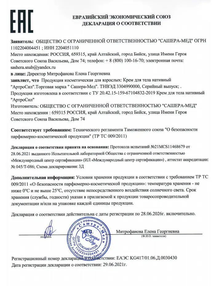 Сертификат крем Артросил