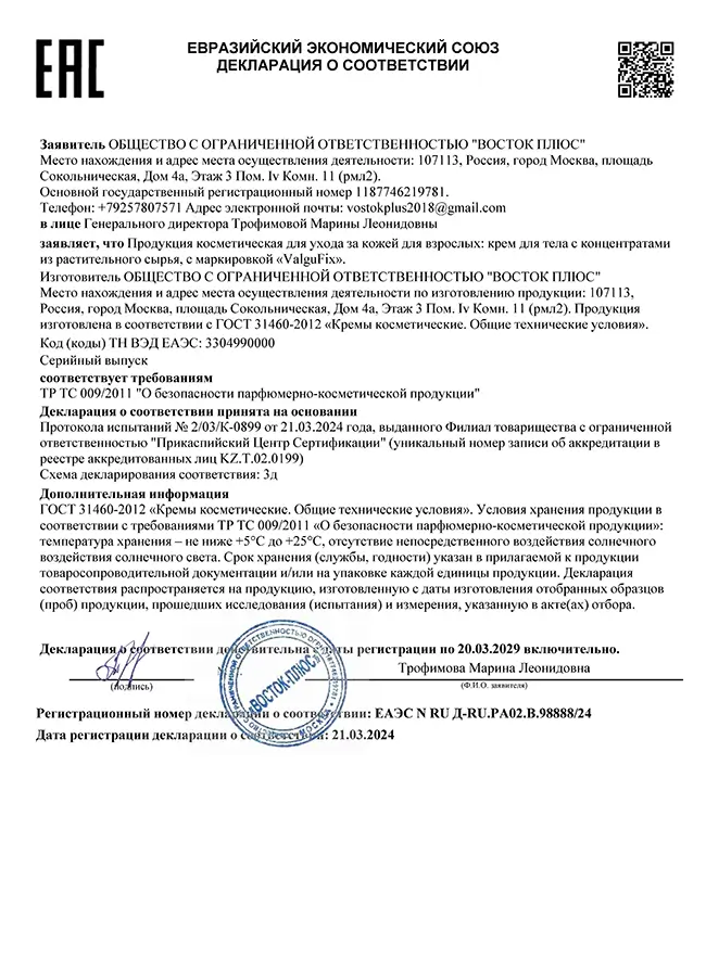 Оказывает комплексное действие на область вальгусной деформации: снимает воспаление, уменьшает болевой синдром, способствует восстановлению микроциркуляции в тканях и улучшает подвижность сустава. Активные компоненты ValguFix обеспечивают местное противоотечное действие и способствуют регенерации тканей.