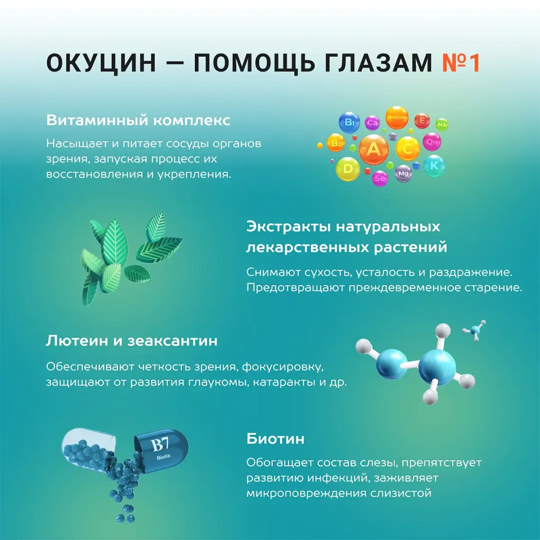 Окуцин оказывает комплексное воздействие на зрительный аппарат: улучшает микроциркуляцию в сосудах глаза, нормализует внутриглазное давление, способствует регенерации тканей сетчатки и роговицы, обеспечивает антиоксидантную защиту. Биоактивные компоненты препарата улучшают метаболические процессы в тканях глаза и способствуют восстановлению зрительных функций.